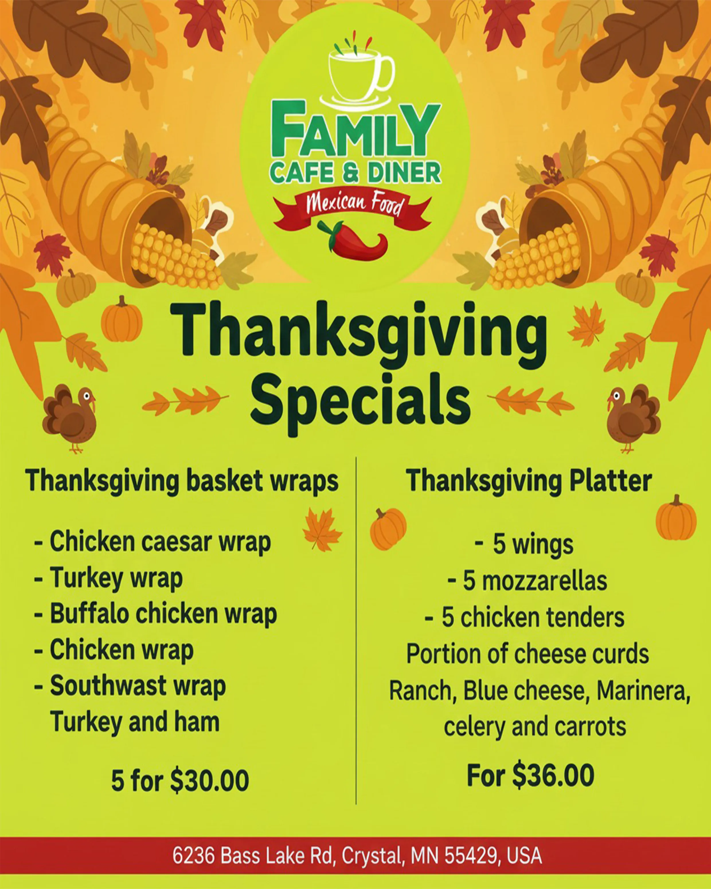 Just about 5 years serving the Christal MN, neighborhood. After many years of cooking for big corporations gained a lot of experience in the kitchen, Pedro Torres saw an opportunity at the Cafe location where he and his family have made their workplace. Serving great food portions and flavors, they make customers happy on every visit.